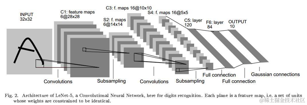 图中的卷积网络工作流程如下,输入层由32×32个感知节点组成,接收原始图像。然后,计算流程在卷积和子抽样之间交替进行,如下所述: