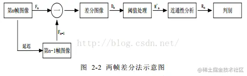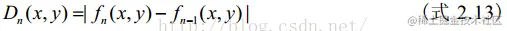 两帧差分法的运算过程如图2-2所示。记视频序列中第n帧和第n−1帧图像为f n和f n−1,两帧对应像素点的灰度值记为f n(x,y)和f n−1(x , y),按照式2.13将两帧图像对应像素点的灰度值进行相减,并取其绝对值,得到差分图像D n: