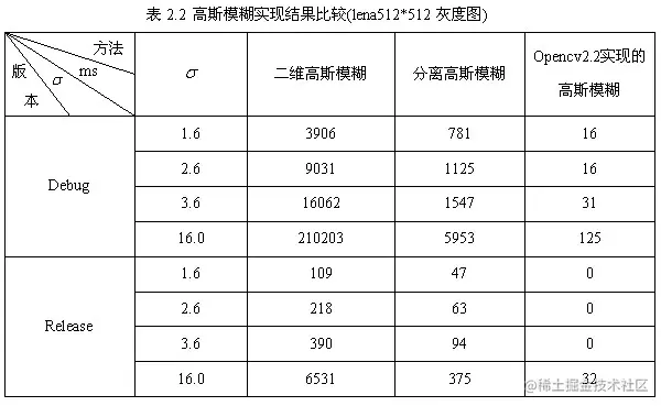 附录1是用opencv2.2实现的二维高斯模糊和分离高斯模糊。表2.2为上述两种方法和opencv2.3开源库实现的高斯模糊程序的比较。
