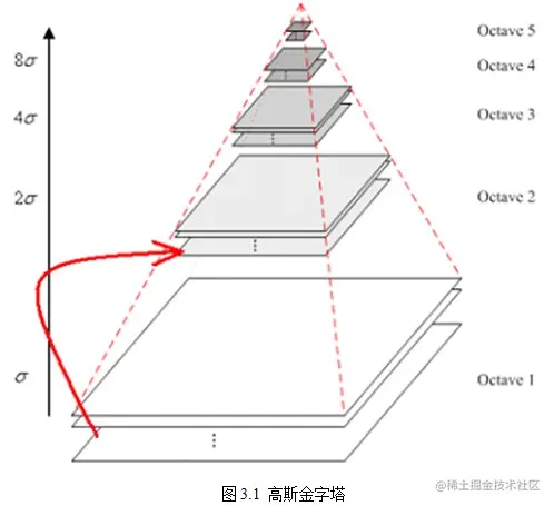 为了让尺度体现其连续性,高斯金字塔在简单降采样的基础上加上了高斯滤波。如图3.1所示,将图像金字塔每层的一张图像使用不同参数做高斯模糊,使得金字塔的每层含有多张高斯模糊图像,将金字塔每层多张图像合称为一组(Octave),金字塔每层只有一组图像,组数和金字塔层数相等,使用公式(3-3)计算,每组含有多张(也叫层Interval)图像。另外,降采样时,高斯金字塔上一组图像的初始图像(底层图像)是由前一组图像的倒数第三张图像隔点采样得到的。