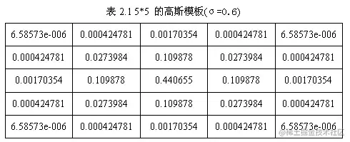 根据σ的值,计算出高斯模板矩阵的大小(),使用公式(1-2)计算高斯模板矩阵的值,与原图像做卷积,即可获得原图像的平滑(高斯模糊)图像。为了确保模板矩阵中的元素在[0,1]之间,需将模板矩阵归一化。5*5的高斯模板如表2.1所示。