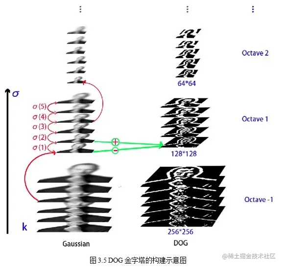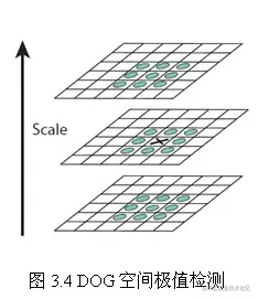 在实际计算时,使用高斯金字塔每组中相邻上下两层图像相减,得到高斯差分图像,如图3.3所示,进行极值检测。