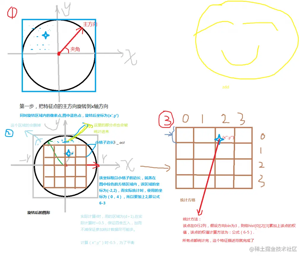 3. 方向确定:基于图像局部的梯度方向,分配给每个关键点位置一个或多个方向。所有后面的对图像数据的操作都相对于关键点的方向、尺度和位置进行变换,从而提供对于这些变换的不变性。旋转不变性,利用梯度的方法求取局部结构的稳定性。