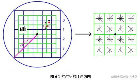 4. 关键点描述(128维):在每个关键点周围的邻域内,在选定的尺度上测量图像局部的梯度。这些梯度被变换成一种表示,这种表示允许比较大的局部形状的变形和光照变化。描述子是关键点领域高斯图像梯度统计结果的一种表示,通过对关键点周围图像区域分块,计算块内梯度直方图,生成具有独特性的向量。