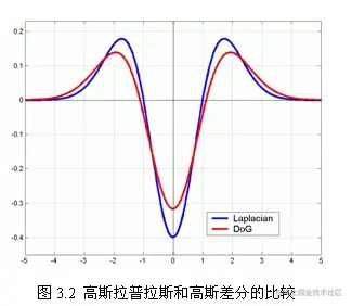 如图3.2所示,红色曲线表示的是高斯差分算子,而蓝色曲线表示的是高斯拉普拉斯算子。Lowe使用更高效的高斯差分算子代替拉普拉斯算子进行极值检测,如下: