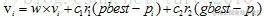 等式右边有三部分组成。第一部分是惯性量,是延续粒子上一次运动的矢量;第二部分是个体认知量,是向个体历史最优位置运动的量;第三部分是社会认知量,是粒子向全局最优位置运动的量。