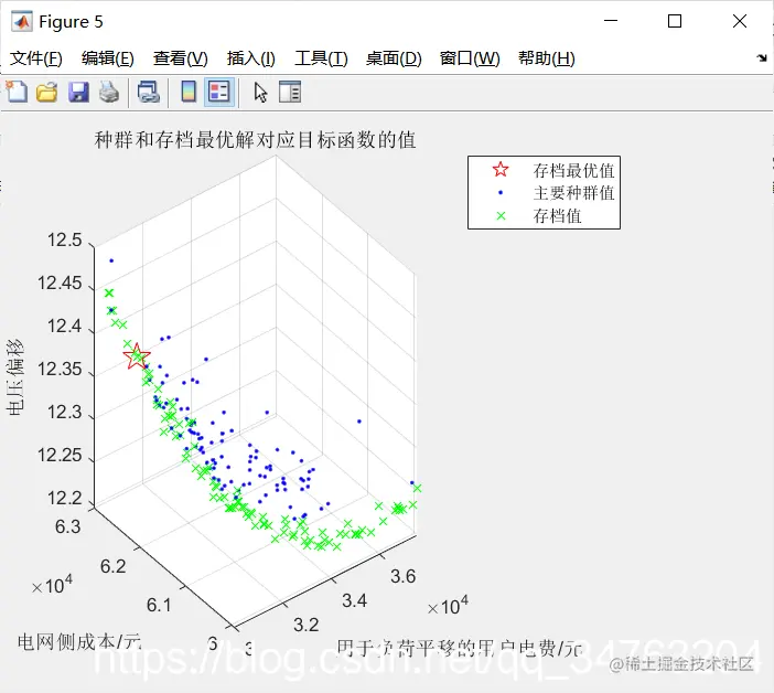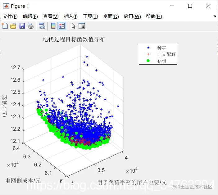 %%注意,目标函数的编写有可能会对粒子存档数产生很大影响,可能会使粒子存档数不会正常增加,产生波动,而达不到设置的你Rep clc; clear ; close all; tic %% Problem Definition %% MOPSO Settings % number_obj=3;%目标函数为3个 nPop=100; % Population Size种群大小100 nRep=100; % Repository Size存档大小为100 MaxIt=150; % Maximum Number of Iterations原始最大迭代次数100 phi1=2.05;%phi1=phi2=2.05 phi2=2.05; phi=phi1+phi2;%4.1 chi=2/(phi-2+sqrt(phi^2-4*phi));%0.7298 w=chi; % Inertia Weight惯性权重 wdamp=1; % Inertia Weight Damping Ratio惯性权重阻尼比1 c1=chi*phi1; % Personal Learning Coefficient个体学习因子1.4962 c2=chi*phi2; % Global Learning Coefficient群体学习因子1.4962 nVar=55;%可以理解为粒子的维数,24+24+7 % VarMin=[0 0 0 0.0033];%粒子能取到的最小值 % VarMax=[0.00195 0.0009 0.00365 0.0037]; %粒子能取到的最大值 load data_load load data_sun % VarMax=repmat(2.2,1,24);VarMax=[VarMax,repmat(0.1,1,24)];VarMax=[VarMax,data_load(4,1:12)];VarMax=[VarMax,data_load(7,1:12)]; % VarMin=repmat(0,1,24);VarMin=[VarMin,repmat(-0.1,1,24)];VarMin=[VarMin,repmat(0,1,12)];VarMin=[VarMin,repmat(0,1,12)];%可平移负荷设置为节点7 VarMax=repmat(0.1,1,24);VarMax=[VarMax,repmat(0.05,1,24)];VarMax=[VarMax,data_load(7,11:14),data_load(7,19:21)]; VarMin=repmat(-0.1,1,24);VarMin=[VarMin,repmat(-0.05,1,24)];VarMin=[VarMin,repmat(0,1,7)];%可平移负荷设置为节点7 end %% Results figure plot(record); xlabel('迭代次数');ylabel('存档最优目标函数值'); title('存档最优目标函数值迭代过程图'); hold on %测试rep中粒子位置是否符合储能限制条件 for i=1:100 rep_flag(i)=battery_flag(rep(i).Position); end costs=GetCosts(particle); rep_costs=GetCosts(rep); [final final_num]=min(integrate); best_position=rep(final_num).Best.Position; % plot3(best_position(1),best_position(2),best_position(3),'rP','MarkerSize',12); % hold on figure; subplot(2,1,1) plot(best_position(1,1:24),'-*'); title('节点10储能运行计划图') xlabel('时间/h');ylabel('充放电功率/Mw'); grid on xlim([1 24]); subplot(2,1,2) plot(best_position(1,25:48),'-*'); grid on xlim([1 24]); title('节点11储能运行计划图') xlabel('时间/h');ylabel('充放电功率/Mw'); % figure % temp=data_load(7,1:12)-best_position(1,49:60); % load7=[temp(1,5:12)+data_load(7,1:8),best_position(1,49:60),temp(1,1:4)+data_load(7,21:24)]; % plot(data_load(7,1:24));hold on % plot(load7,'-*');hold on; % xlim([1 24]); % legend('平移前','平移后') % title('负荷7平移前与平移后日负荷曲线') % xlabel('时间/h');ylabel('功率/Mw'); % grid on figure temp1=data_load(7,11:14)-best_position(1,49:52); temp2=data_load(7,19:21)-best_position(1,53:55); % temp=[temp1,temp2]; load7=[temp1+data_load(7,1:4),temp2+data_load(7,5:7),data_load(7,8:11),best_position(1,49:52),data_load(7,16:18),best_position(1,53:55),data_load(7,22:24)]; plot(data_load(7,1:24));hold on plot(load7,'-*');hold on; xlim([1 24]); legend('平移前','平移后') title('负荷7平移前与平移后日负荷曲线') xlabel('时间/h');ylabel('功率/Mw'); grid on check=zeros(100,1); for number=1:100 check(number)=particle(number).Dominated; end num_position=find(check==0); num=numel(num_position); clear i; figure; best_cost=rep(final_num).Best.Cost; plot3(best_cost(1),best_cost(2),best_cost(3),'rP','MarkerSize',16) hold on plot3(costs(1,:),costs(2,:),costs(3,:),'b.'); hold on; plot3(rep_costs(1,:),rep_costs(2,:),rep_costs(3,:),'gx'); % legend('Best Repository','Main Population','Repository'); legend('存档最优值','主要种群值','存档值'); xlabel('用于负荷平移的用户电费/元');ylabel('电网侧成本/元');zlabel('电压偏移'); grid on; title('种群和存档最优解对应目标函数的值') if it>MaxIt disp(['迭代次数达到限制最大值100,','跳出迭代']); end disp(['最优解为:',num2str(best_position)]); disp(['最优值为:',num2str(best_cost)]); toc