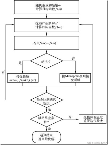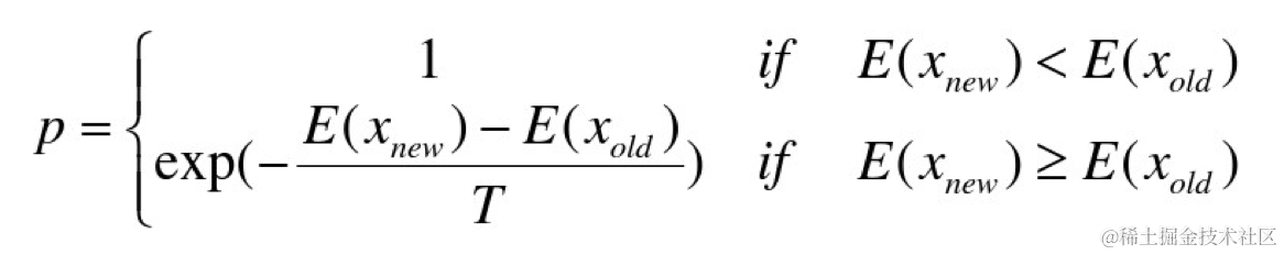 根据Metropolis准则,粒子在温度T时趋于平衡的概率为exp(-ΔE/(kT)),其中E为温度T时的内能,ΔE为其改变数,k为Boltzmann常数。Metropolis准则常表示为