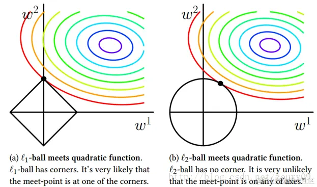 上式中第一个累加项说明了字典学习的第一个目标是字典矩阵与稀疏表示的线性组合尽可能的还原样本;第二个累加项说明了αi应该尽可能的稀疏。之所以用L1范式是因为L1范式正则化更容易获得稀疏解。具体原因参看该书11.4章或移步机器学习中的范数规则化之(一)L0、L1与L2范数。字典学习便是学习出满足上述最优化问题的字典B以及样本的稀疏表示A(A{α1,α2,…,αi})。L1正则化常用于稀疏,可以获得稀疏解。如下图表示,L1正则化交点在轴上,所得的解一般只是在某个轴上有实数,另外的轴为0,从而最终得到稀疏解。