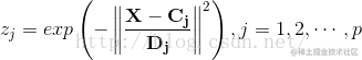 Cj是隐含层第 j 个神经元的中心向量,由隐含层第j个神经元对应于输入层所有神经元的中心分量构成,;Dj为隐含层第j个神经元的宽度向量,与Cj相对应,