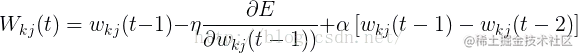 为第k个输出神经元与第j个隐含层神经元之间在第t 次迭代计算时的调节权重。