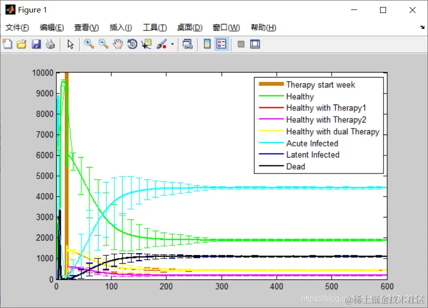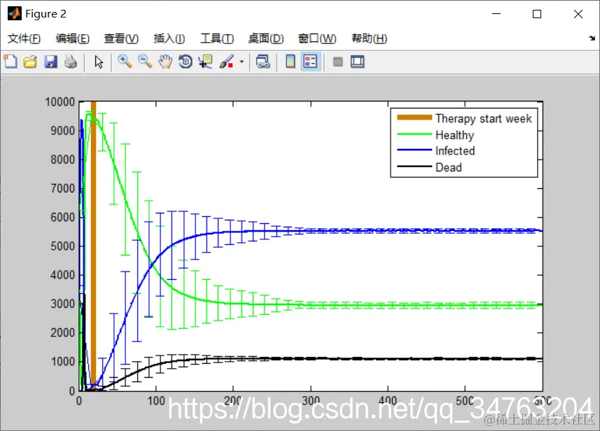 legend( 'Therapy start week', 'Healthy', 'Infected', 'Dead', ...