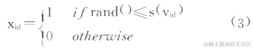 位置更新公式:概率映射方式,采用sigmoid函数将速度映射到 [0, 1] 区间作为概率,这个概率就是粒子下一步取值为1的概率;