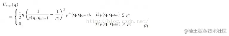 这里的ε是尺度因子.ρ(q,q_goal)表示物体当前状态与目标的距离。引力场有了,那么引力就是引力场对距离的导数(类比物理里面W=FX):
