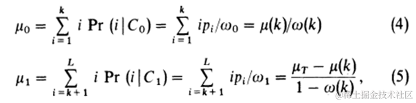 分别为灰度级从1到k的累积出现概率和平均灰度级(一阶累积矩),而
