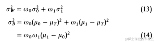 这三个式子分别是类内方差、类间方差和灰度级的总方差。然后,我们的问题就简化为一个优化问题,即寻找一个门限k使(12)式中给出的一个目标函数取最大值。