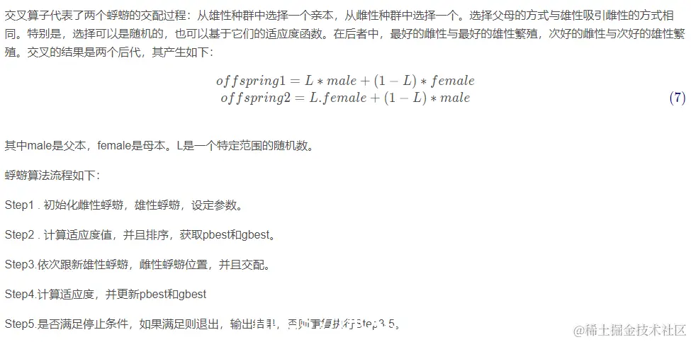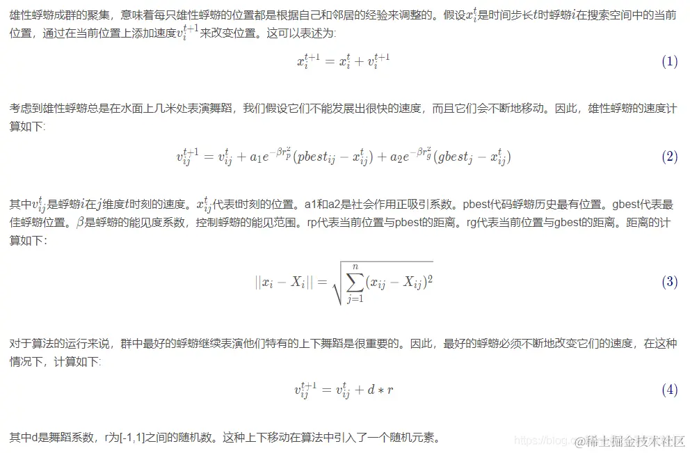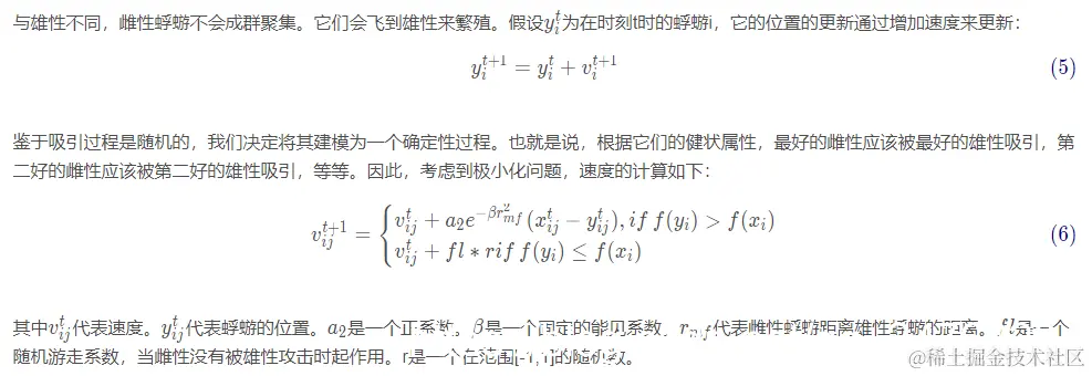 它的灵感来源于蜉蝣的社会行为,特别是它们的交配过程。我们假设蜉蝣从卵中孵化出来后,已经是成虫了,而最适合的蜉蝣存活下来,而不管它们活多久。每个蜉蝣在搜索空间中的位置代表了问题的潜在解决方案。算法的工作原理如下。最初,随机产生两组蜉蝣,分别代表雄性和雌性种群。也就是说,每个蜉蝣被随机放置在问题空间中,作为由d维向量表示的候选解x = ( x 1 , . . . , x d ) x = (x_1,...,x_d)x=(x1,...,xd),并根据预先确定的目标函数f ( x ) f(x)f(x)对其性能进行评价。蜉蝣的速度v = ( v 1 , . . . , v d ) v = (v_1,...,v_d)v=(v1,...,vd)定义为其位置的变化,每个蜉蝣的飞行方向是个体和社会飞行经验的动态交互作用。特别是,每个蜉蝣都会调整自己的轨迹,使其朝向目前为止的个人最佳位置(p b e s t pbestpbest),以及迄今为止群中任何蜉蝣所获得的最佳位置(g b e s t gbestgbest)。