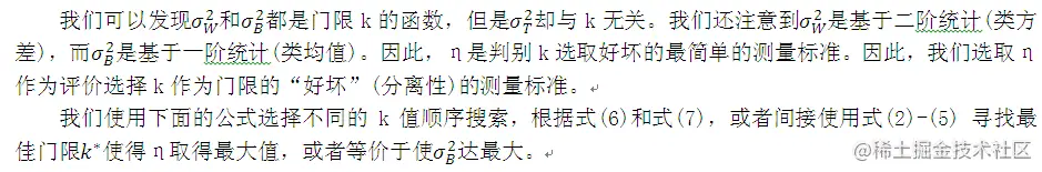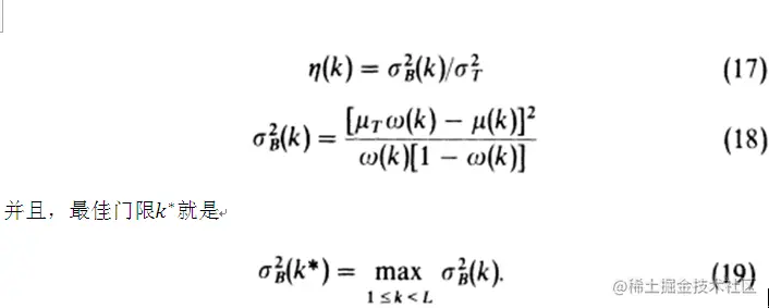 这三个式子分别是类内方差、类间方差和灰度级的总方差。然后,我们的问题就简化为一个优化问题,即寻找一个门限k使(12)式中给出的一个目标函数取最大值。