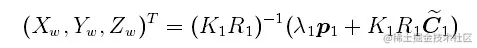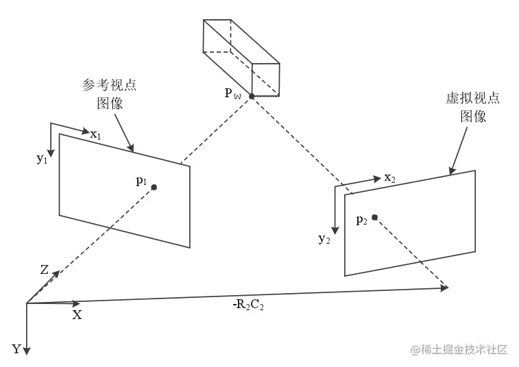 最终,将式18代入式17中,我们可以得到点 Pw在虚拟视点图像上的像素坐标p2: