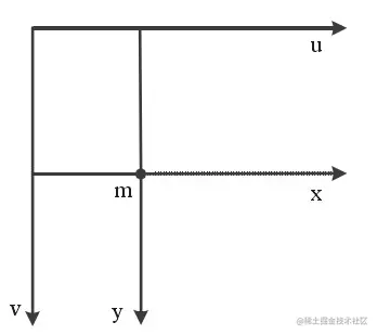 在直角整数像素坐标系u-v中,每个像素的坐标(u,v)T分别代表该像素在二维图像阵列中的列数和行数。由于此坐标系并未用物理单位表示出像素点在图像中的实际位置,因此需要建立以物理单位表示的图像坐标系x-y。该坐标系以图形内某一点m为原点,x和y轴分别于u,v平行。若m在u,v坐标系中的坐标为(mu,mv),每个像素在x和y轴方向上的物理尺寸为dx,dy。则图像中任意一个像素在两个坐标系下的坐标有如下关系: