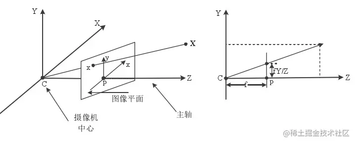 这是从三维欧式空间到两维欧式空间的一个映射。投影中心称为摄像机中心,也称为光心。摄像机中心到图像平面的垂线称为摄像机的主轴或主射线。而主轴与图像平面的交点称为主点,过摄像机中心平行于图像平面的平面称为摄像机的主平面。如果用其次矢量表示世界和图像点,那么中心投影可以非常简单地表示成齐次坐标之间的线性映射。