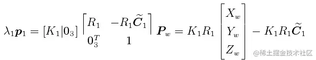 齐次矢量,表示世界坐标系中的某一点的坐标,而Xcam是以摄像机坐标系来表示的同一点,那么我们可以记Xcam= R(X-C),其中 C 表示摄像机中心在世界坐标系中的坐标,R是一个3 × 3 的旋转矩阵,表示摄像机坐标系的方位。这个方程在齐次坐标下可以写成: