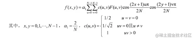 在傅立叶变换过程中,如果被展开的函数是实偶函数,那么其傅立叶变换中只包含余弦项,基于傅立叶变换的这一特点,人们提出了离散余弦变换。DCT变换先将图像函数变换成偶函数形式,再对其进行二维离散傅立叶变换,因此DCT变换可以看成是一种简化的傅立叶变换。离散余弦变换叶分为一维离散余弦变换和二维离散余弦变换,在图像处理中用到二维变化,所以介绍下其二维定义,其他定义可查阅《数字图像处理》——冈萨雷斯。其二维离散余弦变换定义如下式: