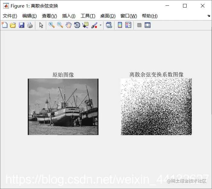 close all;clear all;clc;I = imread ('boats.bmp');J = dct2(I);figure('Name','离散余弦变换');subplot(1,2,1);imshow(I); title('原始图像');subplot(1,2,2);imshow(log(abs(J))); title('离散余弦变换系数图像');