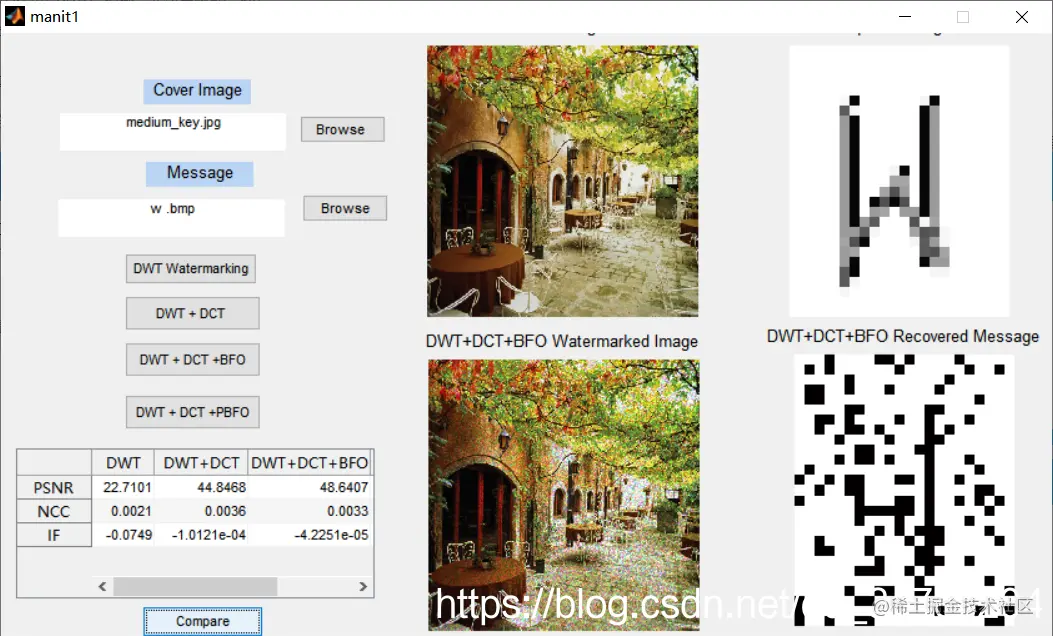 [watermrkd_img,PSNR,IF,NCC,recmessage]=dwt(cover_object,message,k);