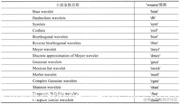 在 MATLAB 小波变换工具箱中提供了多个母小波族函数如下表所示,不同的母小波具有不同的特点,其对图像的处理结果也不同。