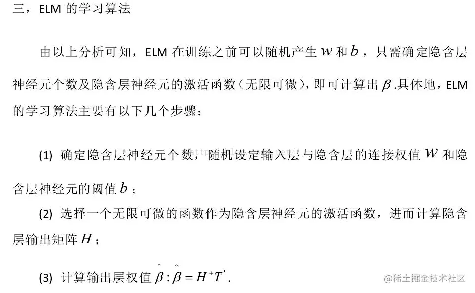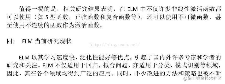 总结一下:ELM与BP都是基于前馈神经网络的架构之下的,他们的不同之处在于学习的方法不同,BP是通过梯度下降法,利用反向传播的方式进行的学习,需要不断地进行迭代来更新权重和阈值,而ELM则是通过增加隐层节点的个数来达到学习的目的,隐层节点的个数一般是根据样本的个数来确定的,巧妙地将隐含层的个数与样本的个数进行了联系。其实在许多前向神经网络中,默认的最大的隐层节点的个数就是样本数,(如RBF)。它不需要进行迭代,所以速度就比BP要快很多。ELM的精华之处就在于那两条他所依赖的定理,这些定理决定了他的学习方式。输入层和隐含层之间的权重w和隐含层节点的阈值b是通过随机初始化得到的,而且不需要进行调整。一般隐层节点的个数与样本的个数相同(在样本数比较少的情况下)。
