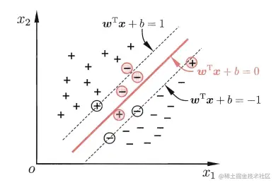 此时的红色样本实际为1(-1),预测为-1(1),已经不满足 y(wx+b)>1的约束条件,