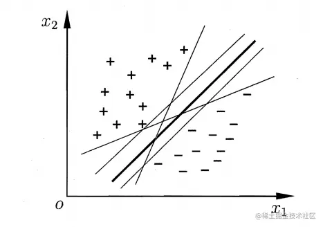 从直观上看,取粗线为宜,但是这条粗线有很多的平行线,都可以实现分类,那么怎么取呢?