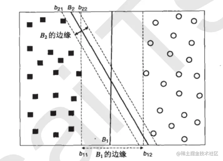 b11和b12之间的距离,叫做B1这条决策边界的边际(margin),也有叫“间隔”,记为d,当然也有把b11和B1的距离叫边际的,无所谓,不影响理论