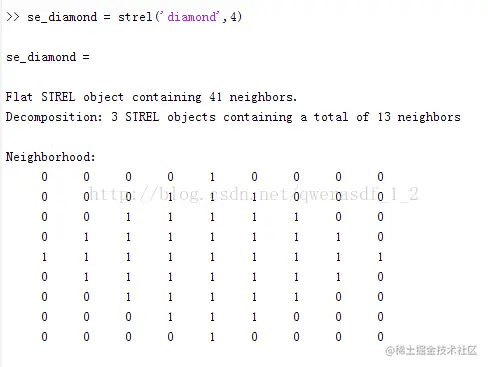 se_diamond =strel('diamond',4)创建一个菱形的结构元素,4是从结构化元素原点到其点的距离,必须为非负整数。