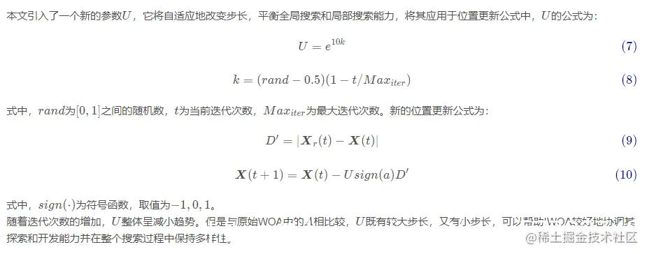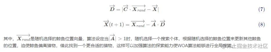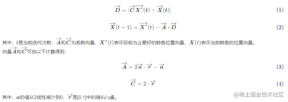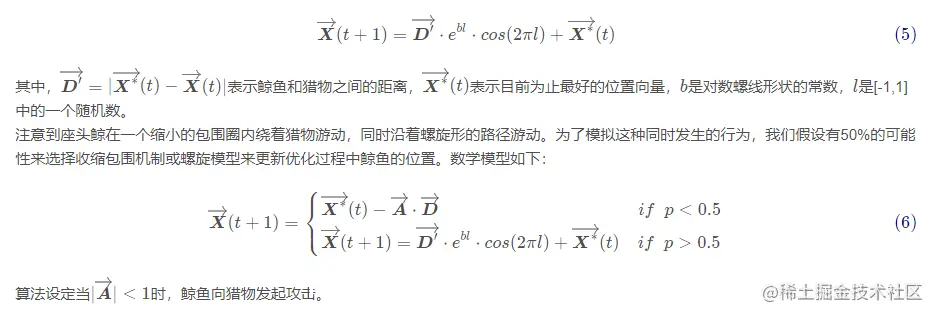 座头鲸能识别猎物的位置并围着它们转。由于最优位置在搜索空间中的位置是未知的,WOA算法假设当前的最佳候选解是目标猎物或接近最优解。在定义了最佳候选解之后,其他候选位置将尝试向最佳位置移动并更新其位置。此行为由以下等式表示: