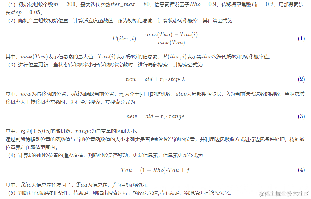 迭代寻优为整个算法的核心。首先计算状态转移概率;然后根据转移概率的值判断哪些蚂蚁需要进行局部搜索,哪些蚂蚁需要进行全局搜索,之后再进行搜索,搜索完了之后一定要进行边界处理,并更新蚂蚁的位置;最后,更新信息素,每次迭代保存最优解。