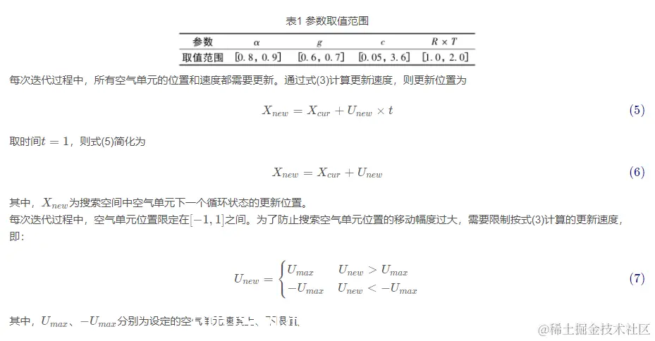 3) 开始迭代。更新空气质点的速度和位置,计算质点压力值并以升序方式重新排列种群顺序。