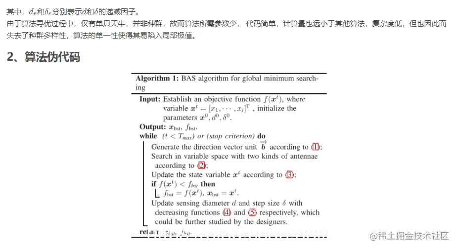 Jiang和Li在2017年受到天牛规食及寻偶行为的启发,提出了天牛须搜索算法(Beetle antennae search algorithm, BAS)。天牛在空气中捕获食物及潜在配偶的味道,根据天牛两侧天牛须检测到的气味浓度前进。该算法复杂度低,且不需要知道梯度信息等就能实现优化的目的。