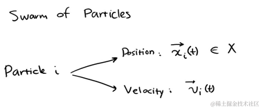 将每个个体表示为粒子。每个个体在某一时刻的位置表示为,x(t),方向表示为v(t)