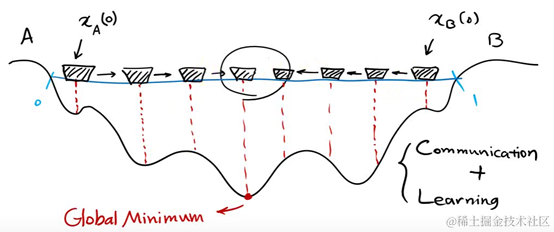 在一个湖中有两个人他们之间可以通信,并且可以探测到自己所在位置的最低点。初始位置如上图所示,由于右边比较深,因此左边的人会往右边移动一下小船。