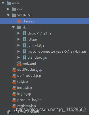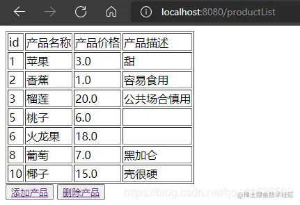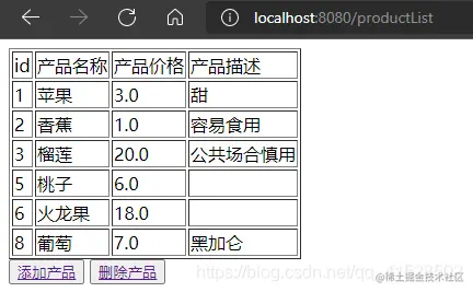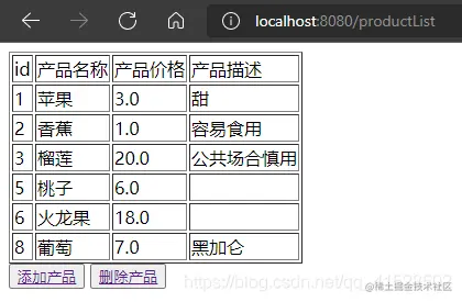 productList.jsp可以展示产品数据,含有两个按钮实现产品的添加、删除(按钮添加a标签实现页面跳转);