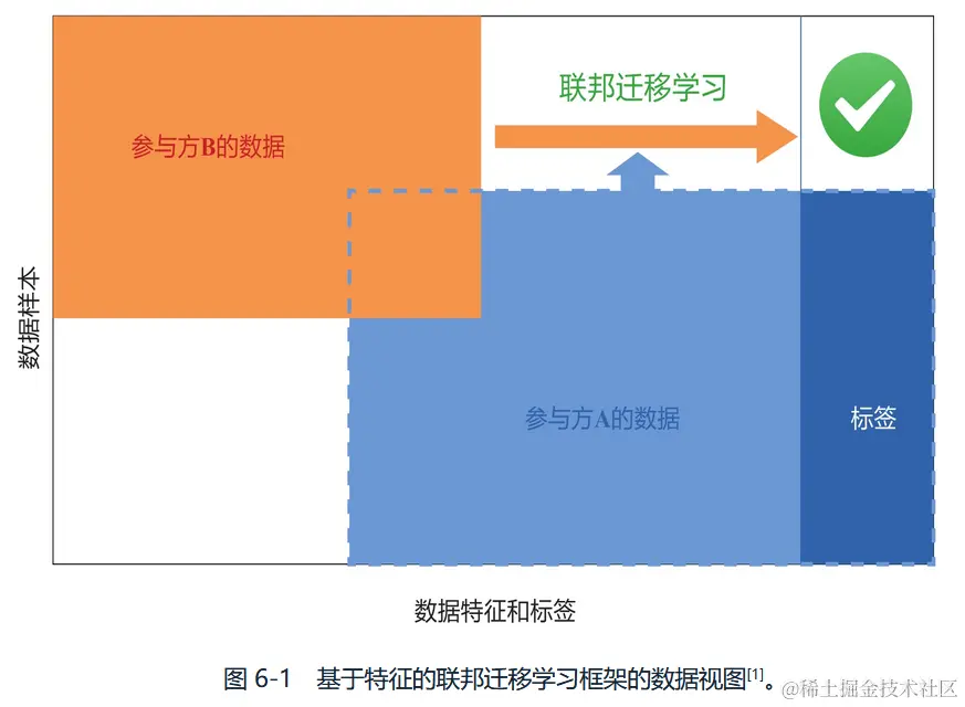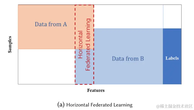 纵向联邦学习(Vertical Federated Learning,VFL)也可以理解为 按特征划分的联邦学习,可应用于数据集上具有 相同的样本空间、 不同的特征空间的参与方所组成的联邦学习。 出于不同的商业目的,不同组织拥有的数据集通常具有不同的特征空间,但这些组织可能共享一个巨大的用户群体,如上图。 通过使用VFL,我们可以利用分布于这些组织的异构数据,搭建更好的机器学习模型,并且不需要交换和泄露隐私数据。