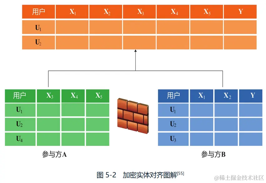 如上面两篇文献中描述,使用该技术来确保A方和B方不需要暴露各自的原始数据便可以对其共同用户。如图5-2.