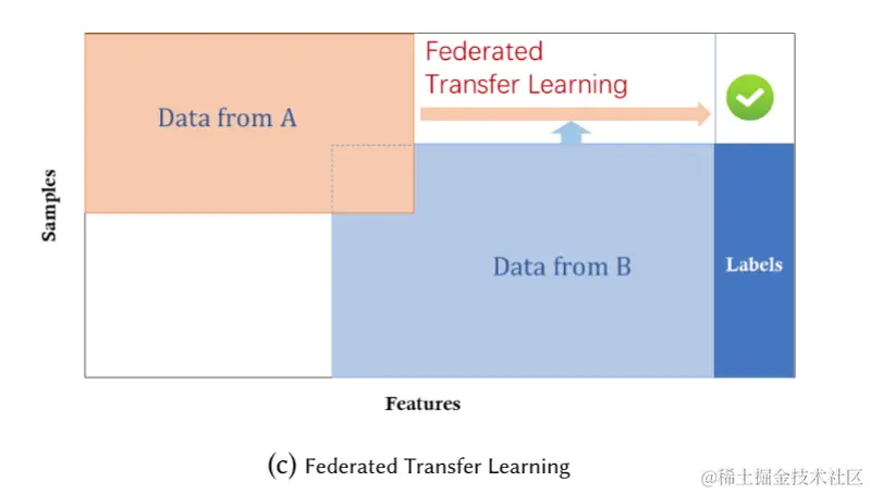 为解决上述问题,联邦学习可以结合迁移学习技术,使其可以应用于更广的业务范围,同时可以帮助只有少量数据(较少重叠的样本和特征)和若监督(较少标记)的应用建立有效且精确的机器学习模型,并且遵守数据隐私和安全条例的规定。 将这种组合称为 联邦迁移学习。
