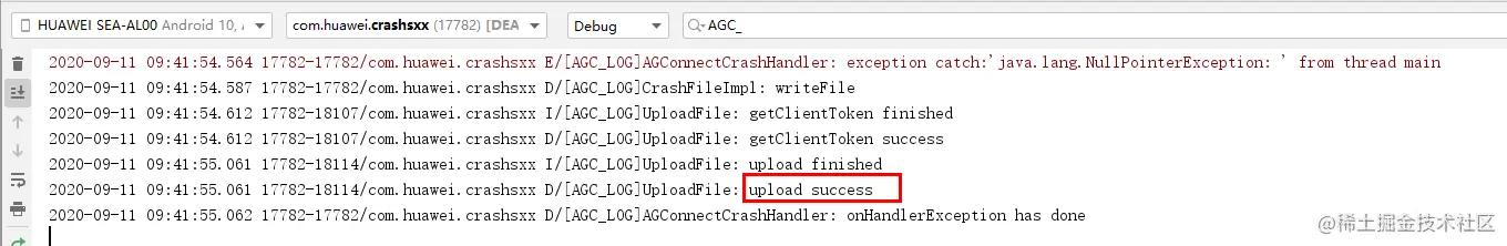 执行“adb shell setprop log.tag.AGC_LOG VERBOSE” 开启Crash SDK的调试模式,在应用崩溃时看是否有打印“upload success”,有打印说明端侧已经上报,否则需要检查集成情况。