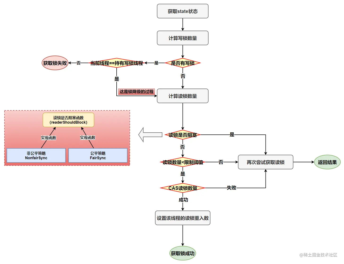 - readerShouldBlock读锁是否阻塞实现取决公平与非公平的策略(FairSync和NonfairSync)