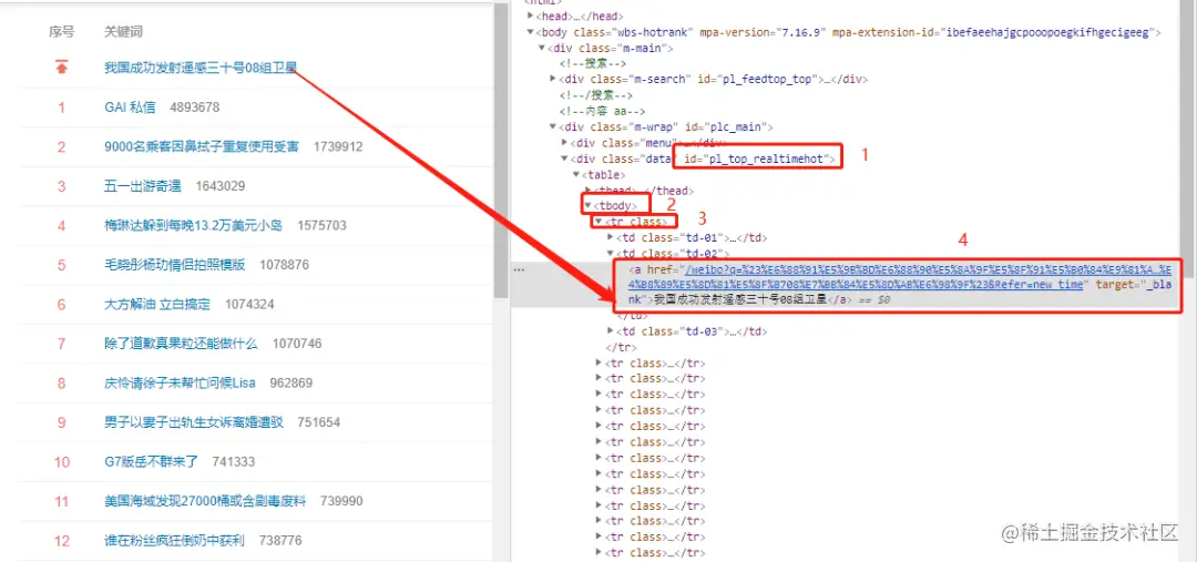数据列表在id为pl_top_realtimehot中,接着往下找tbody,tr是热点数据的列表,每一个tr中都有a标签,a标签中有热点标题和对应热点链接。