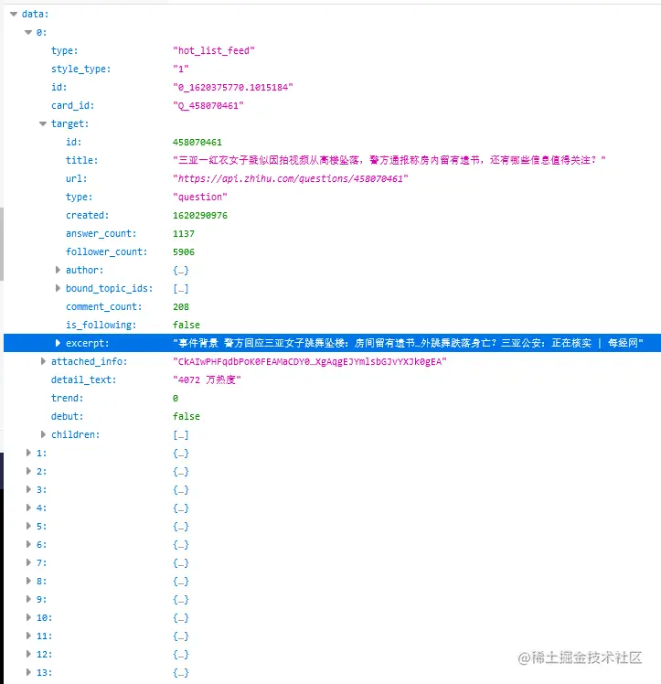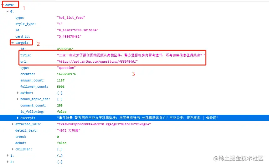 数据在data里面,每一条数据的热搜标题和链接都在target下,热搜标题是title,热搜标题链接是url