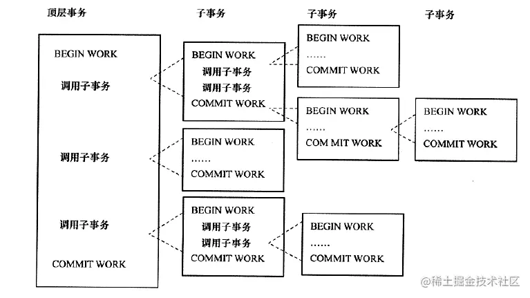 是一个层次结构架构。由一个顶层事务(top-level transaction)控制着各个层次的事务。顶层事务之下嵌套的事务被称为子事务(subtransaction),其控制每个局部的变换。